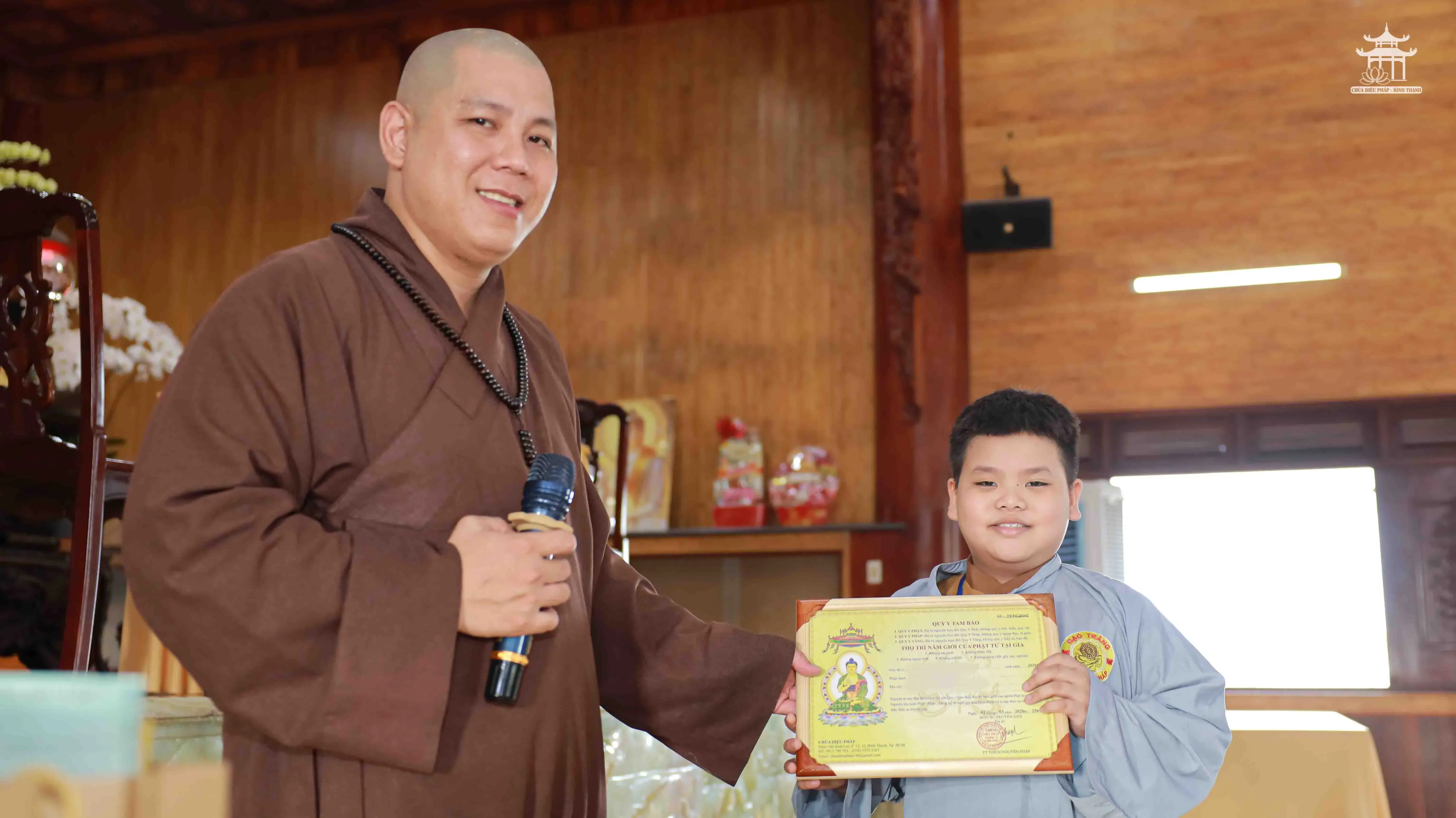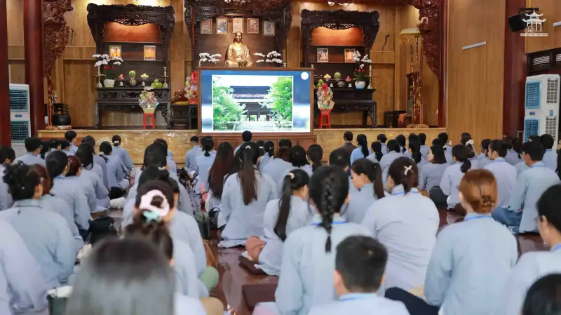 Buổi lễ diễn ra dưới sự chứng minh của Thầy Trụ trì chùa Diệu Pháp cùng chư tôn đức Tăng, với sự tham dự của gần 200 Phật tử. Sau khi điểm danh và mượn áo tràng, đại chúng được xem phim tư liệu về lịch sử truyền thừa của chư vị Tổ sư, cùng những video tái hiện về nghiệp báo khi phạm năm giới tại gia. Những thước phim không chỉ giúp Phật tử hiểu rõ hơn về nguồn cội đạo Phật, mà còn khơi dậy niềm kính tin sâu sắc đối với Tam Bảo.