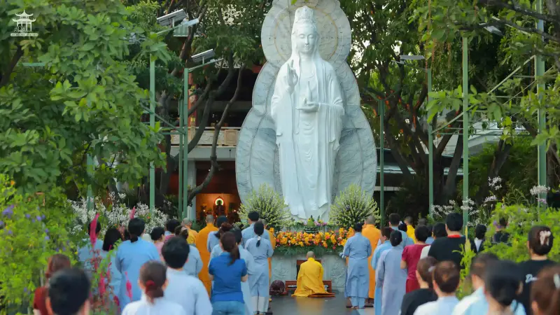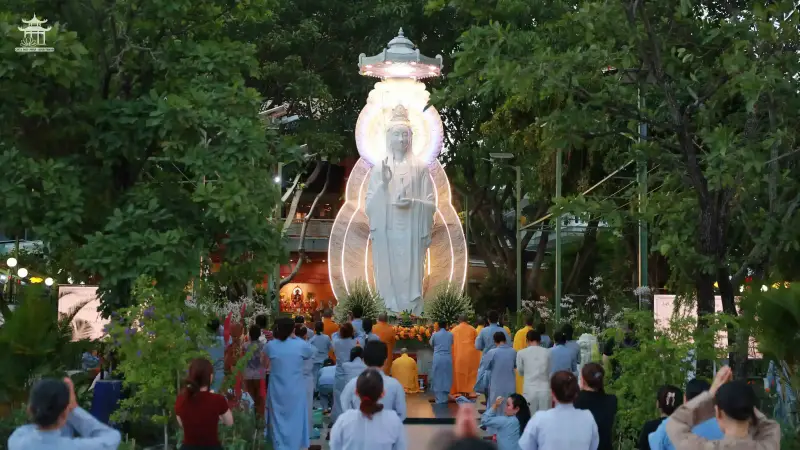Sau thời pháp, đại chúng dùng bữa chiều trong sự hòa hợp và thanh tịnh. Lễ vía được tiếp nối tại Tôn tượng Quán Thế Âm Bồ Tát, nơi chư Tăng cùng quý Phật tử trang nghiêm trì Chú Đại Bi và tiếp tục đảnh lễ 300 lạy còn lại trong pháp Lạy Ngũ Bách Danh. Trong không khí thiêng liêng và thành kính, toàn thể đạo tràng đồng nhất tâm hướng về Đức Bồ Tát Quán Thế Âm, dâng lên lòng biết ơn và niềm kính ngưỡng sâu xa.