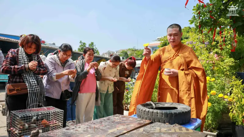 Ngay từ sớm, quý Phật tử đã vân tập về chùa, cùng chuẩn bị cho nghi thức phóng sanh với tâm niệm thành kính. Trước khi cử hành nghi lễ, đại chúng đồng tụng kinh, niệm Phật, hồi hướng công đức và phát khởi tâm từ đến tất cả chúng sanh. Trong không khí trang nghiêm ấy, lễ phóng sanh không chỉ là một nghi thức mang ý nghĩa cứu vật, mà còn là dịp để mỗi người lắng lòng, quán chiếu về giá trị của sự sống và nuôi dưỡng hạnh lành trong đời sống tu học hằng ngày.